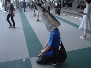 このあとのミニシアターでのパフォーマンスの出演者のかたが宣伝中。なぜか正座。このパフォーマンスについてはまたあとで。